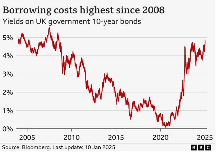 UK borrowing costs have been rising in recent months. The cost of borrowing over 10 years hit its highest level since 2008, while the pound has fallen and on Friday dropped below $1.22 against the dollar after stronger-than-expected job figures in the US.