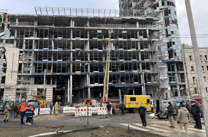 The main destruction occurred in the central Shevchenkivskyi district, where there is now a deep crater in the road outside a business centre.