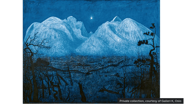 The height and scope of these unpopulated views also convey a sense of isolation and loneliness. Harald Sohlberg, whose luminescent 1914 version of Winter Night in the Mountains is widely considered to be the national painting of Norway, wrote: “The longer I stood gazing at the scene, the more I seemed to feel what a solitary and pitiful atom I was in an endless universe… It was as if I had suddenly awakened in a new, unimagined and inexplicable world… Above the white contours of a northern winter stretched the endless vault of heaven, twinkling with myriads of stars. It was like a service in some vast cathedral.”