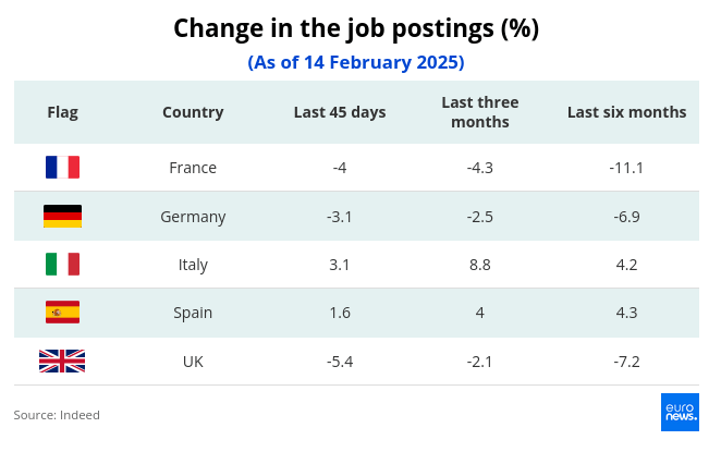 Based on job postings from the hiring platform Indeed, Euronews Business analyses 2025’s job market trends across Europe’s five largest economies.