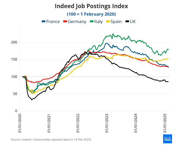 According to data from the hiring platform Indeed, job postings in Italy and Spain rose by 9% and 4%, respectively, on a seasonally adjusted basis in the three months leading up to February 14, 2025. In contrast, job postings declined in France (4%), Germany (2%), and the UK (2%) over the same period.