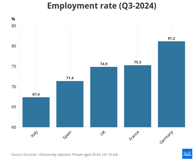 On the other hand, Italy (67.4%) and Spain (71.4%) recorded the lowest employment rates among these countries in the third quarter of 2024, according to Eurostat and the ONS.