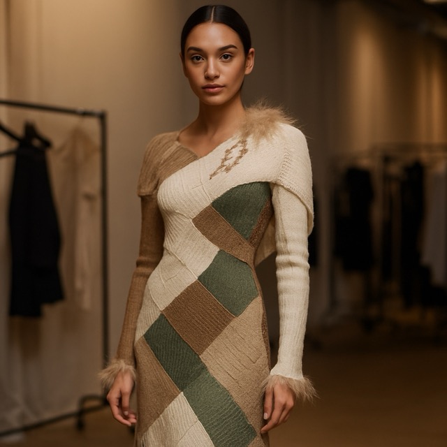 Emily switched lanes from her season‑long menswear instincts and chased drama: a sculptural asymmetrical dress tessellated from bright, pre‑loved knits, blocked with remnant florals that nodded to 1970s optimism. Where earlier episodes showcased her zero‑waste pattern brain, the finale demanded theatre. She answered with bravura cutting and fast finishing, the look reading like a color‑rich topography: peaks and valleys mapped in ribbing, cables and purl. The risk was coherence. Could a knit‑forward statement convince the judges as a red‑carpet proposition rather than an art‑school exercise?