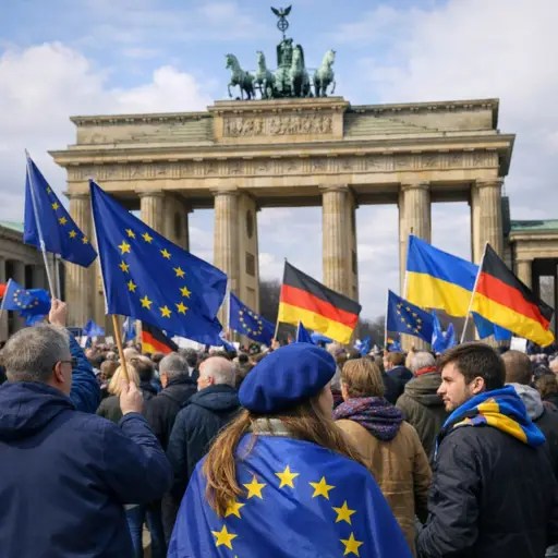 The demonstration unfolded as Germany stands at a political crossroads with voters heading to the polls and debates intensifying about the country’s future role within the European project, lending the gathering a broader resonance beyond its size.