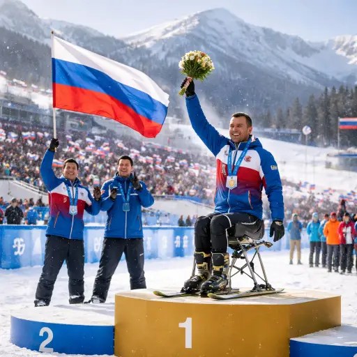 Inside the stadium, the ceremony unfolded with the familiar rituals of international competition. The athlete stood on the podium wearing winter gear dusted with snow, raising a gloved hand as the flag rose above the venue. Teammates watched from the stands, some cheering, others visibly emotional. It marked the first time in more than a decade that the Russian anthem had been played after a Paralympic winter victory, an occurrence that immediately drew attention far beyond the sporting world.